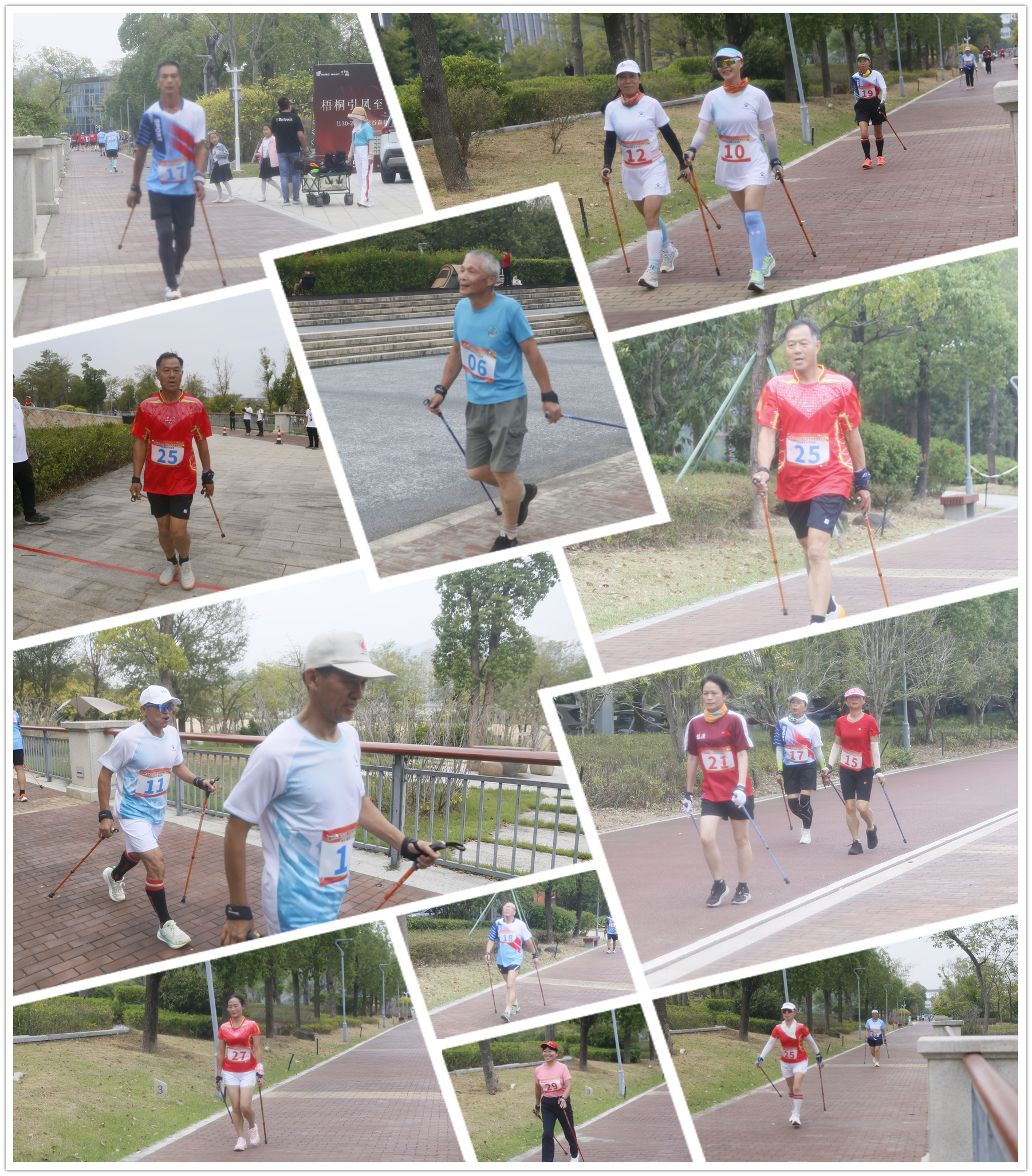 下午,活动转场至风景宜人的三江口公园,进行5公里户外越野项目。秋日阳光下,参赛者们精神饱满、步履从容,矫健的身影与波光粼粼的江面、摇曳的花木相映成趣,成为公园里一道流动的、充满活力的风景线,生动诠释了持杖健走这项运动与自然融合的魅力。