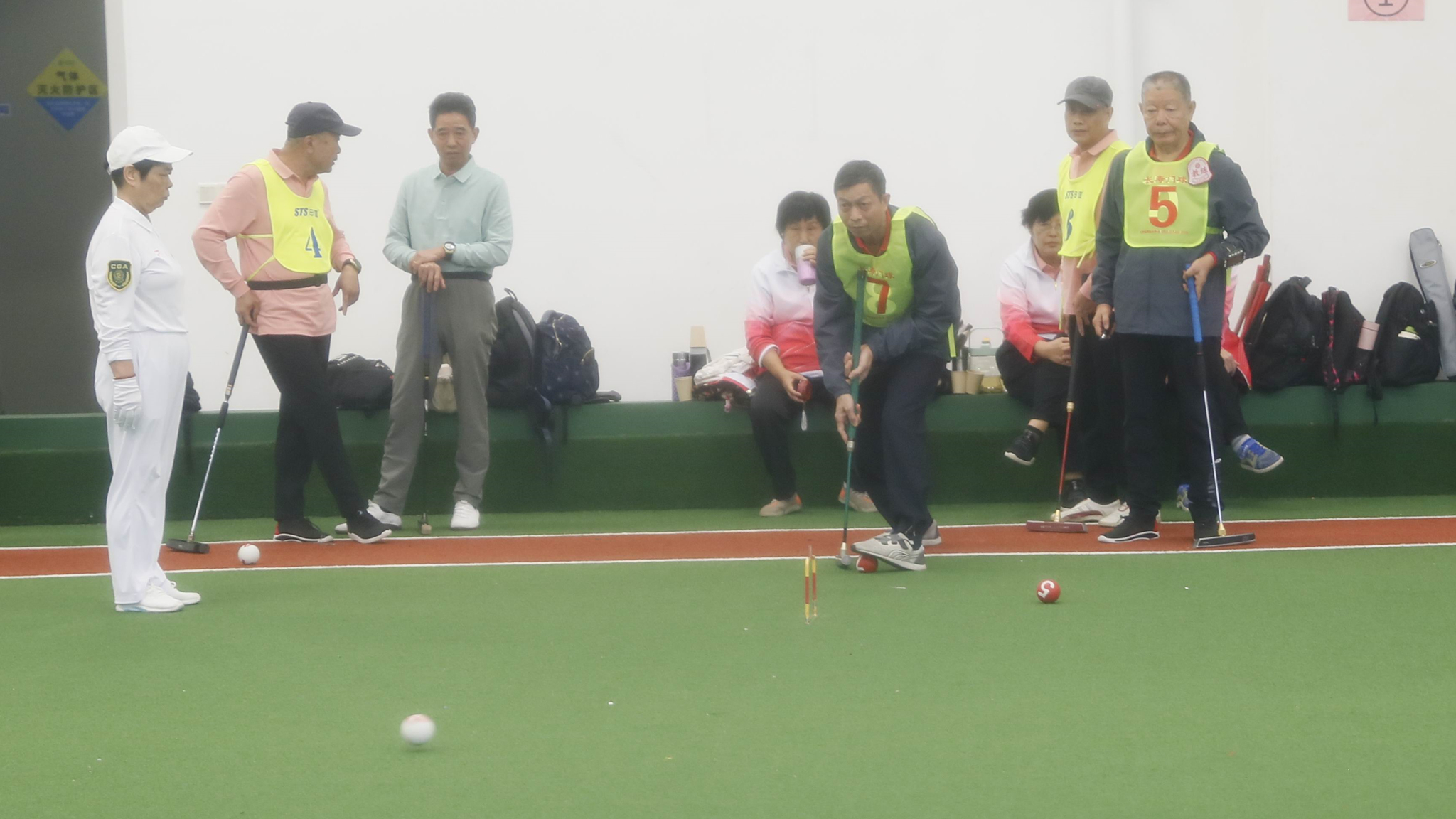 赛事分为男子组与女子组团体项目。比赛现场气氛热烈,秩序井然。赛场上,银发选手们个个精神矍铄,斗志昂扬。他们手握球槌,气定神闲,展现了深厚的门球功底。“一看、二站、三瞄准”,每一个指令都化为沉着稳健的动作;击球精准有力,闪送恰到好处,过门一气呵成。