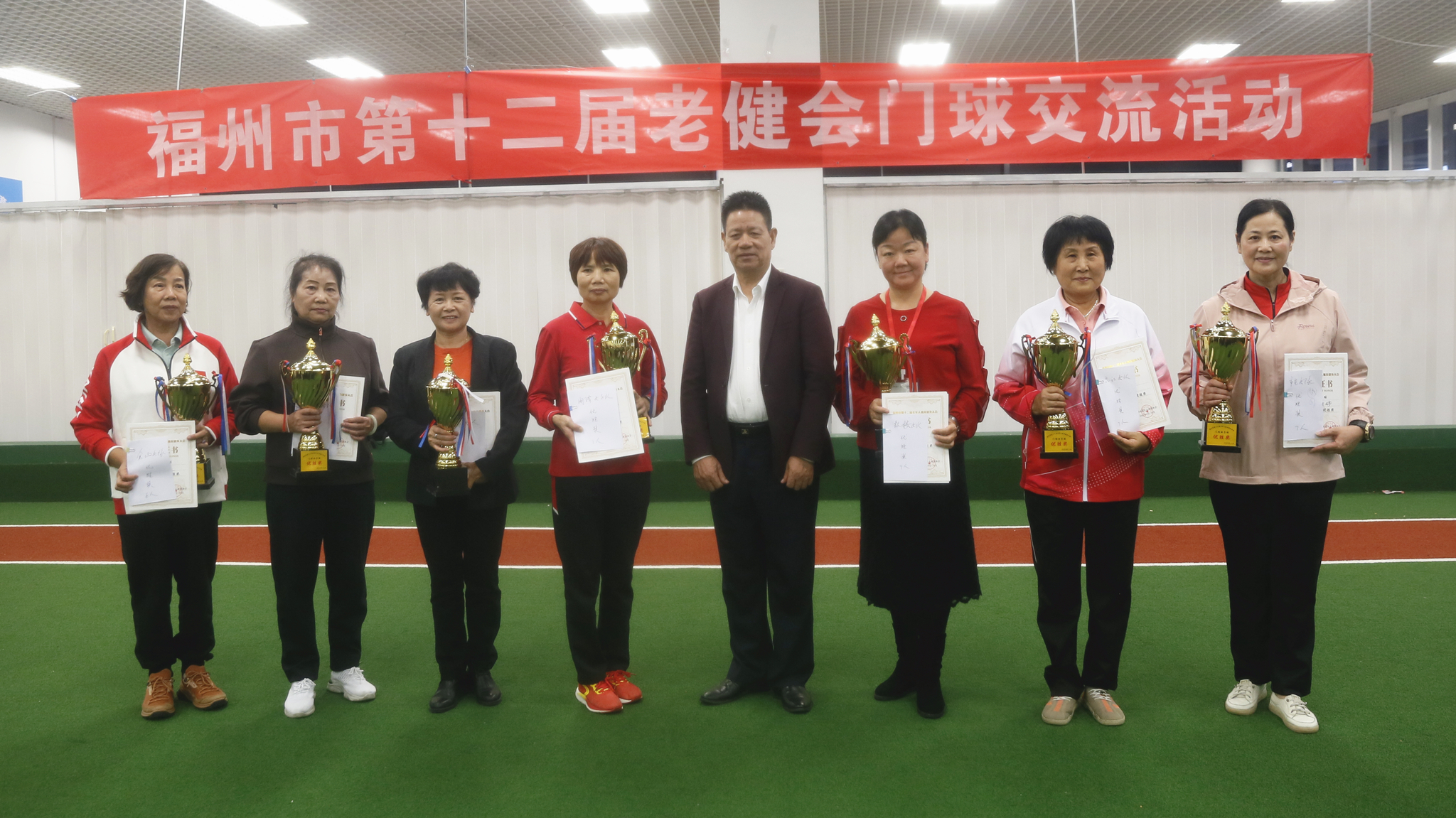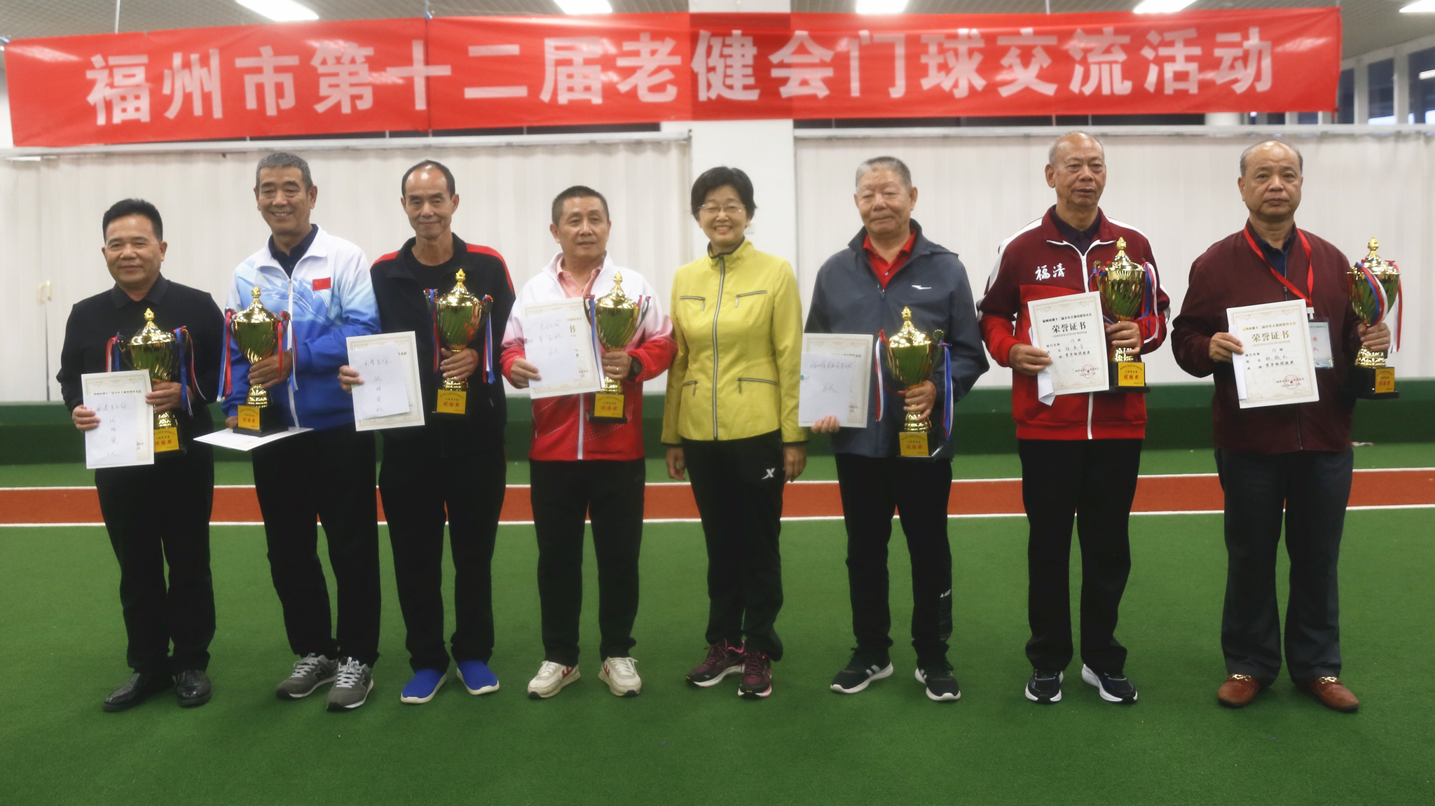 经过两天74场的激烈角逐,最终连江县、福清市、市直机关、台江区、闽清县、晋安区、永泰县代表队夺得男子团体优胜奖;市直机关、台江区、鼓楼区、闽清县、长乐区、永泰县、仓山区代表队则斩获女子团体优胜奖。市老体协常务副主席张涵,中国门协市场与发展委员会主任、市门协荣誉会长薛理振,市体育局群体处负责人陈海清,市门协会长、市老体协门球专委会常务副主任王瑞为获奖队伍颁奖。